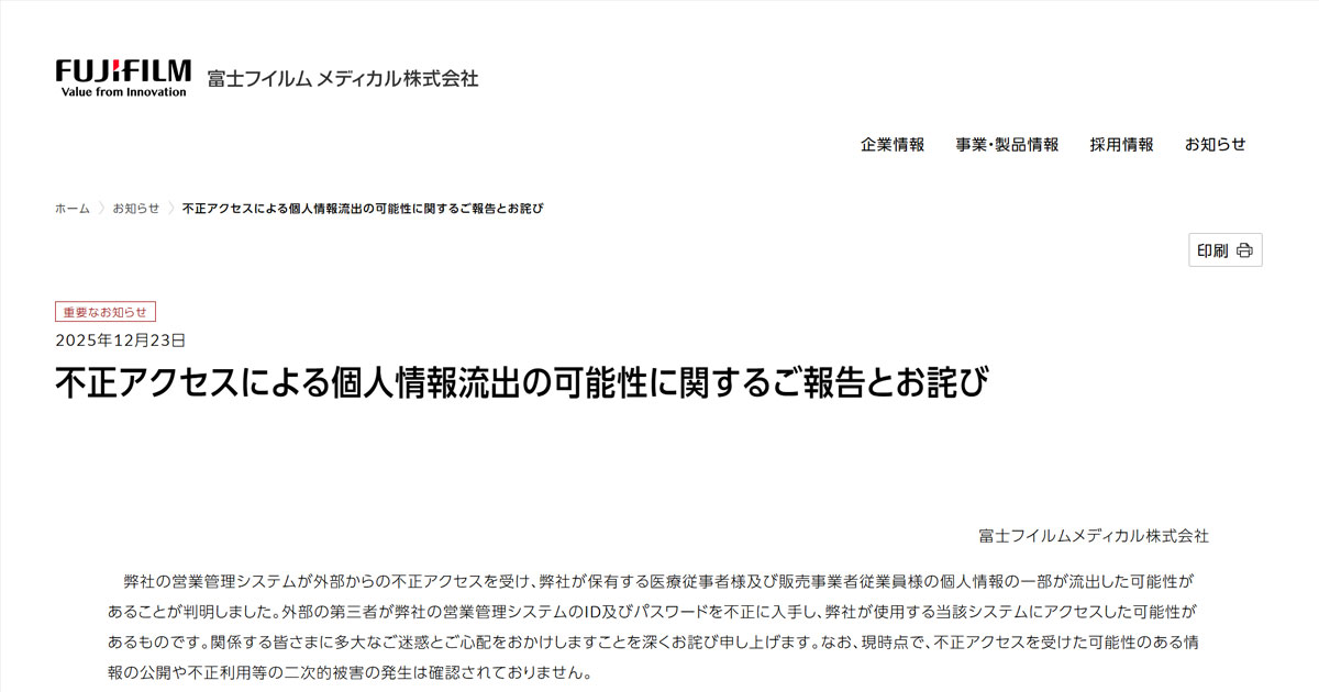 - 8 富士フイルムメディカル、約59万人分流出か 営業管理システムに侵入、ID・パスワード不正入手