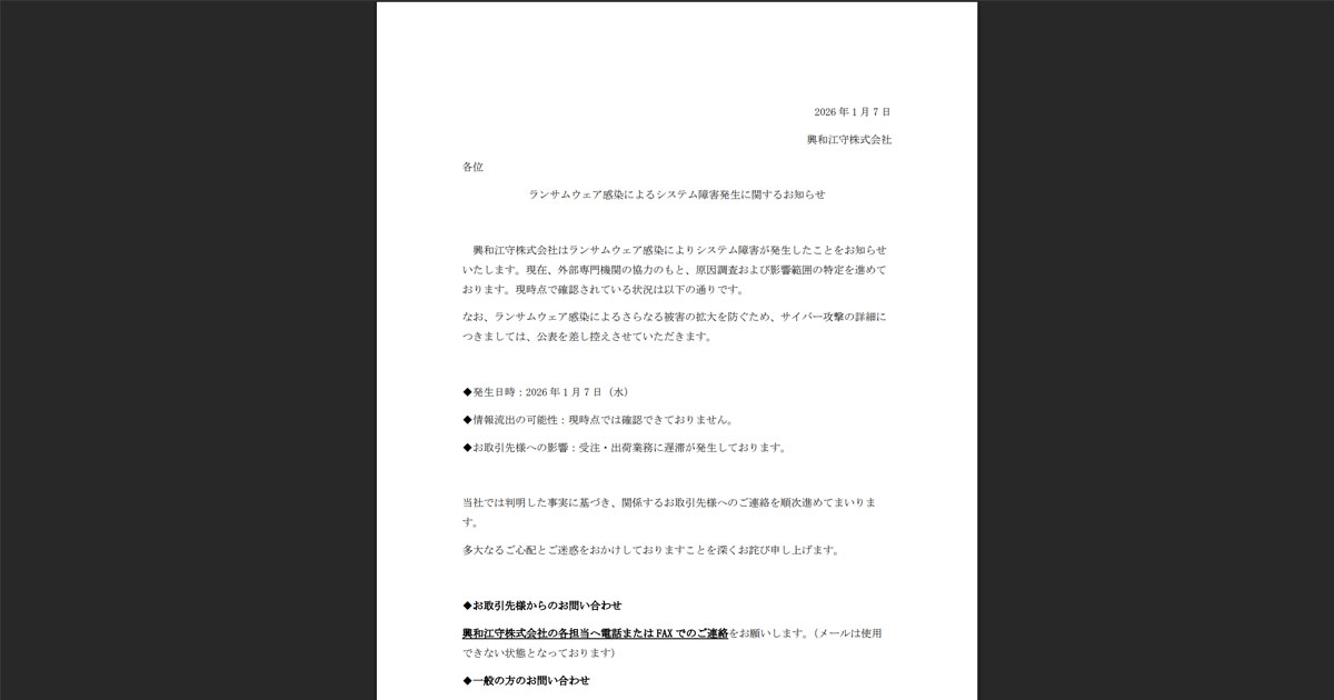 - 11 興和江守 ランサムウェア感染でシステム障害 受注・出荷業務に遅滞 メール使用不可に