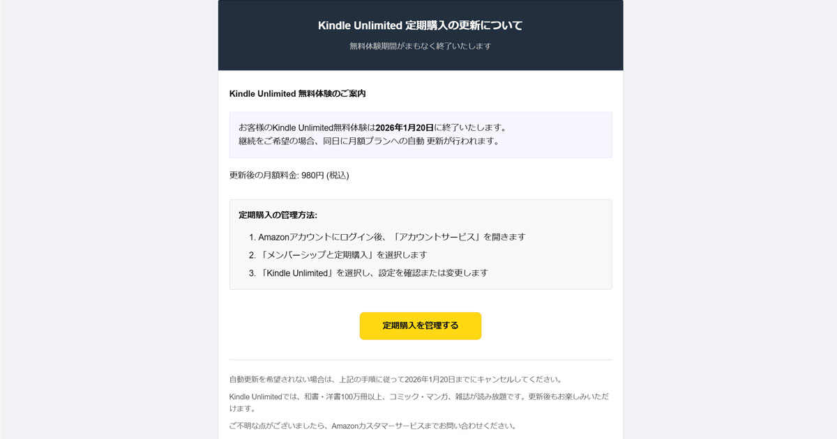 「【重要】Kindle Unlimited定期購入の更新について」はフィッシング詐欺メー…