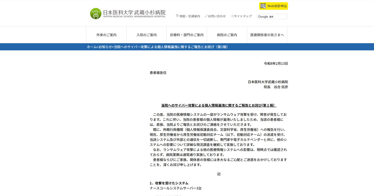 - 12 日本医科大学武蔵小杉病院 ランサムウェア攻撃で患者約1万人分の個人情報漏洩 VPN経由で侵入か