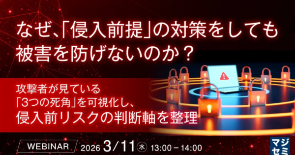 「侵入前提」対策でも防げぬ被害、その「死角」を解説へ マジセミがウェビナー開催 2026年2月24日:企業動向 マジセミ株式会社は2026年3月11日、「なぜ、「侵入前提」の対策をしても被害を防げないのか?」と題したウェビナーを開催します。ランサムウェアや情報漏えい被害が続く中、EDRなど侵入後対策だけでは不十分な現状を背景に、攻撃者が侵入前に見ている「死角」に焦点を当
