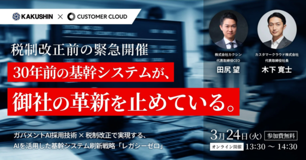 カスタマークラウドとカクシン、AI活用した基幹システム刷新ウェビナー開催へ――10万部著者・田尻氏登壇、税制改正も追い風か 2026年3月22日:企業動向 カスタマークラウド株式会社と株式会社カクシンは、2026年3月24日に無料オンラインウェビナー「LEGACY ZERO」を開催します。キーエンス出身の経営者でベストセラー著者の田尻望氏が登壇し、AIを活用した基幹システム刷新戦略と税制改正による投資戦略を解説し