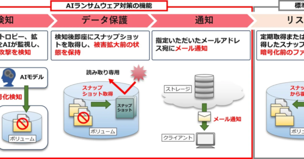 NTTスマートコネクト、「スマートストレージ」にAIランサムウェア対策を導入 2026年3月30日:企業動向 NTTスマートコネクトが、クラウド型ストレージサービス「スマートストレージ」に「AIランサムウェア対策」メニューを追加しました。AIがリアルタイムで攻撃を検知し、自動スナップショットでデータを保護、迅速な復旧を可能にすることで、深刻化するサイバー攻撃から企業デ