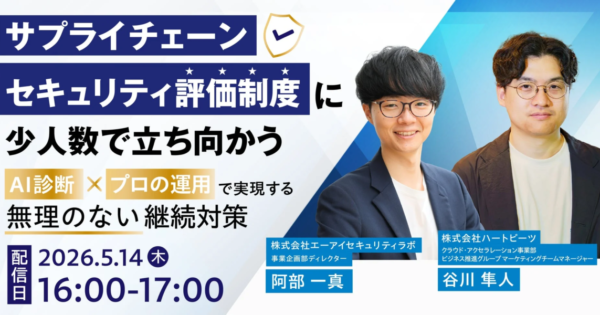 経済産業省のサプライチェーンセキュリティ評価制度へ対応、AI診断と専門運用で継続対策を実現するウェビナー開催 2026年4月14日:企業動向 株式会社エーアイセキュリティラボと株式会社ハートビーツは、2026年度に始まる経済産業省の「サプライチェーンセキュリティ評価制度」への対応を支援するため、共催ウェビナーを2026年5月14日に開催します。本ウェビナーでは、AIを活用した脆弱性診断と専門家による