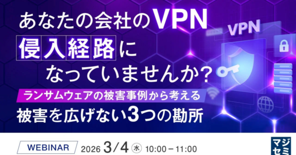 企業のVPN、侵入経路化に警鐘か?ランサムウェア被害拡大阻止へウェビナー開催 2026年2月5日:企業動向 株式会社フーバー・クロステクノロジーズは、マジセミ株式会社の協力のもと、2026年3月4日に「あなたの会社のVPN、侵入経路になっていませんか?」と題したウェビナーを開催します。ランサムウェア被害の増加とVPNの脆弱性を背景に、侵入を前提とした被害拡大防止策に