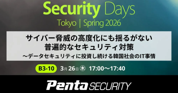 ペンタセキュリティ、Security Days Spring 2026 Tokyoで講演へ データセキュリティの普遍的対策を解説 2026年2月5日:企業動向 情報セキュリティ企業のペンタセキュリティ株式会社は、2026年3月26日に東京で開催される「Security Days Spring 2026 Tokyo」にて講演すると発表した。同社のプリンシパルセキュリティコンサルタントである美濃部崇氏が、「サイバー脅威の