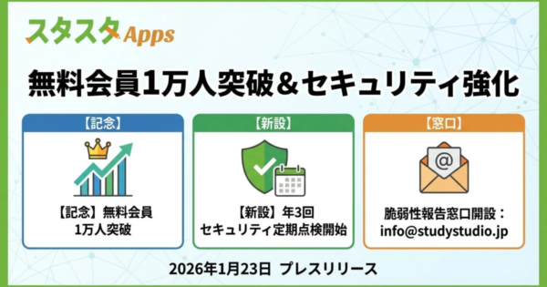 スタスタApps、無料会員1万人突破でセキュリティ強化 英検対策アプリ、年3回点検を制度化 2026年1月23日:企業動向 スタディスタジオ株式会社が運営する英検®対策Webアプリ「スタスタApps」は、無料会員1万人突破を受け、セキュリティ運用を強化しました。年3回の定期点検と脆弱性報告窓口の整備を通じて、ユーザーが安心して学習できる環境の提供を目指します。