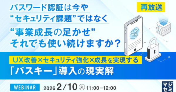 パスワード認証が事業成長の足かせに、パスキー導入でUX改善とセキュリティ強化を実現するウェビナー開催 2026年1月22日:企業動向 マジセミ株式会社は、パスワード認証がビジネスの成長を阻害する要因となっている現状を課題とし、パスワードレスで安全な「パスキー(FIDO認証)」の導入による解決策を解説するウェビナーを再放送します。