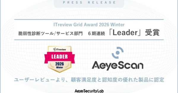 AeyeScan、ITreview Grid Awardで6期連続「Leader」に選出か 脆弱性診断ツール部門 2026年1月22日:企業動向 株式会社エーアイセキュリティラボが提供するクラウド型Webアプリケーション脆弱性診断ツール「AeyeScan」が、「ITreview Grid Award 2026 Winter」において、「脆弱性診断ツール/サービス」部門で6期連続となる「Leader」に選