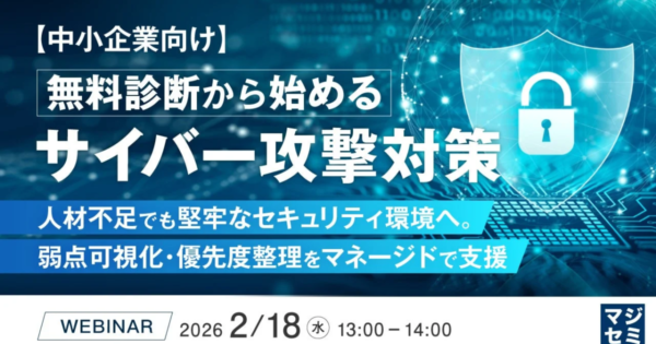 中小企業向けサイバー攻撃対策、無料診断で課題可視化へ—マジセミがウェビナー開催 2026年1月19日:企業動向 マジセミ株式会社は2026年2月18日、中小企業を対象としたサイバー攻撃対策ウェビナーを開催します。巧妙化する脅威に対し、無料診断を通じて自社の弱点を明確にし、人材不足でも実現可能な実践的セキュリティ対策の構築を支援します。