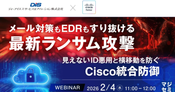 「メール対策もEDRもすり抜ける最新ランサム攻撃」対策ウェビナー開催へ マジセミなど 2026年1月19日:企業動向 マジセミ株式会社は、ディーアイエスサービス&ソリューション株式会社、シスコシステムズ合同会社と協力し、メール対策やEDRを回避する最新のランサム攻撃に対応するためのウェビナーを2026年2月4日に開催すると発表しました。本ウェビナーでは、侵入後の被害を最小化す