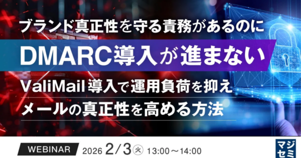 DMARC導入の課題とブランド真正性保護:マジセミがウェビナー開催 2026年1月16日:企業動向 マジセミ株式会社は、DMARC導入が進まない現状とブランド真正性保護の重要性に焦点を当てたウェビナーを開催します。なりすましメール対策の誤解を解消し、ValiMailを用いた次世代型認証サービス環境の構築を通じて、正規メールの真正性を証明しブランド価値を守る方