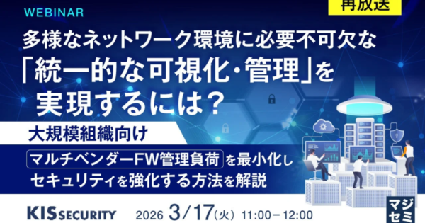 複雑化する企業ネットワークの可視化・管理、再放送ウェビナーで解説へ 2026年3月2日:企業動向 KIS Security株式会社は、複雑化する企業ネットワークの「統一的な可視化・管理」を実現するためのウェビナーを再放送します。リモートワーク普及に伴うハイブリッド構成の増加やサイバー脅威の高度化に対応するため、マルチベンダー環境の運用課題と、その解決策とし