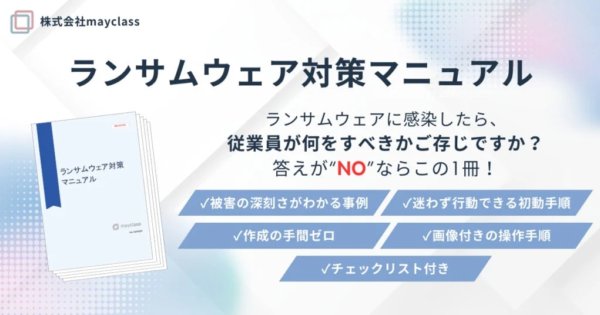 mayclass、ランサムウェア対策マニュアルを発売 初動対応の迷いを解消へ 2026年1月14日:企業動向 株式会社mayclassは、ランサムウェア感染時の初動対応における従業員の判断の迷いを解消し、被害拡大を防ぐための実践的な「ランサムウェア対策マニュアル」の販売を開始しました。現場で「誰が・何を・どの順で行うか」を明確にすることに特化した内容です。