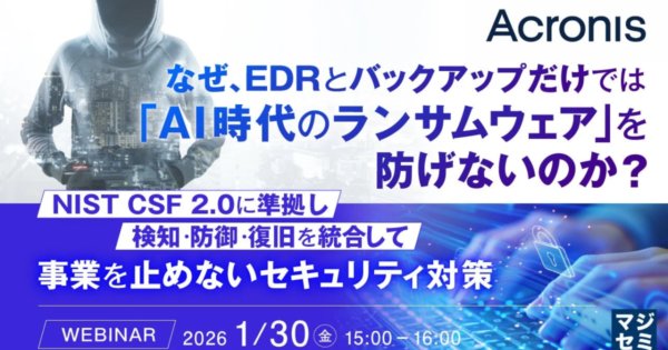 AI時代のランサムウェア、EDRとバックアップだけでは防げないか マジセミがウェビナー開催 2026年1月14日:企業動向 マジセミ株式会社は、AIの悪用により高度化するランサムウェア攻撃に対し、従来のEDRやバックアップだけでは防ぎきれない現状と、NIST CSF 2.0を軸とした事業継続型セキュリティの必要性を解説するウェビナーを開催します。