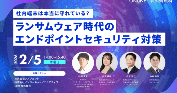 ランサムウェア脅威に挑む、エンドポイントセキュリティ対策セミナー開催へ 2026年1月13日:企業動向 LRM株式会社は、巧妙化するサイバー攻撃に対抗するため、ランサムウェア時代のエンドポイントセキュリティ対策をテーマとしたオンラインセミナーを2026年2月5日に開催すると発表しました。本セミナーでは、メールやブラウザを起点とする脅威への具体的な対策が解説されま