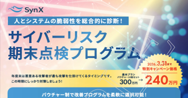 SynX、バウチャー制「サイバーリスク期末点検プログラム」を提供開始か 高度化する脅威に対応 2026年1月15日:企業動向 株式会社SynXは、企業を取り巻くサイバーリスクの高度化に対応するため、改善策を柔軟に選択できるバウチャー制を採用した「サイバーリスク期末点検プログラム」の提供を開始しました。期間限定のキャンペーンも実施されます。