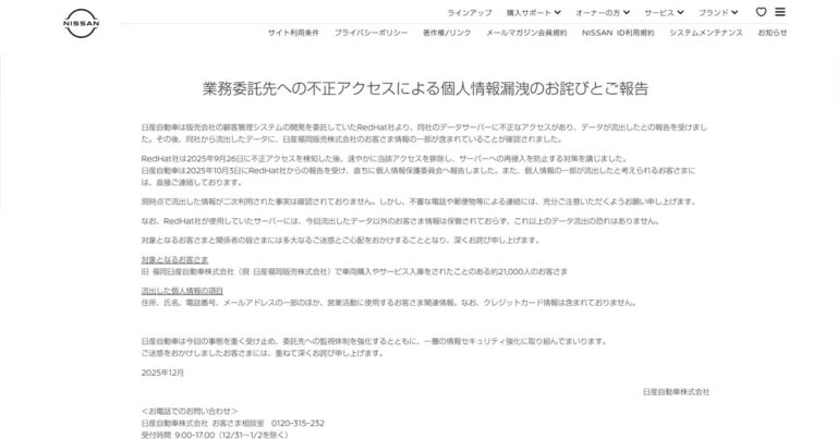 日産、委託先から2.1万件流出 福岡販売の顧客情報、RedHat社サーバー侵入で