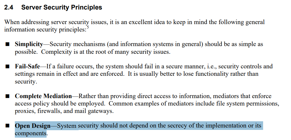 としており、要するに「システムのセキュリティは、実装やその構成要素が秘匿されていることに依存すべきではない」としている。