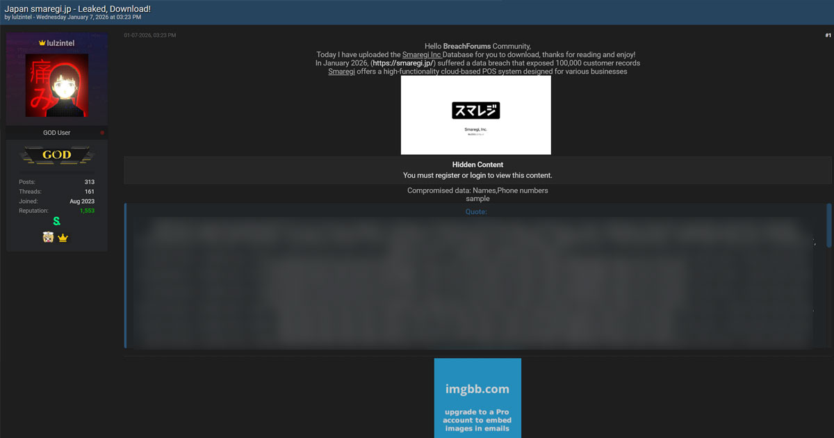 インターネット上のハッカーフォーラムにスマレジのデータ侵害を主張する投稿が確認された。