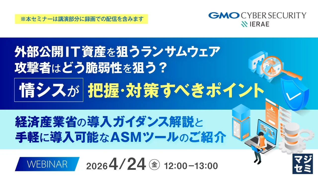 マジセミ株式会社は、GMOサイバーセキュリティ byイエラエ株式会社と協力し、ランサムウェア攻撃から外部公開IT資産を守るためのウェビナーを2026年4月24日に開催すると発表しました。経済産業省のASM導入ガイダンスの解説と、ASMツールの紹介を通じて、情報システム担当者が把握すべきポイントを提示します。