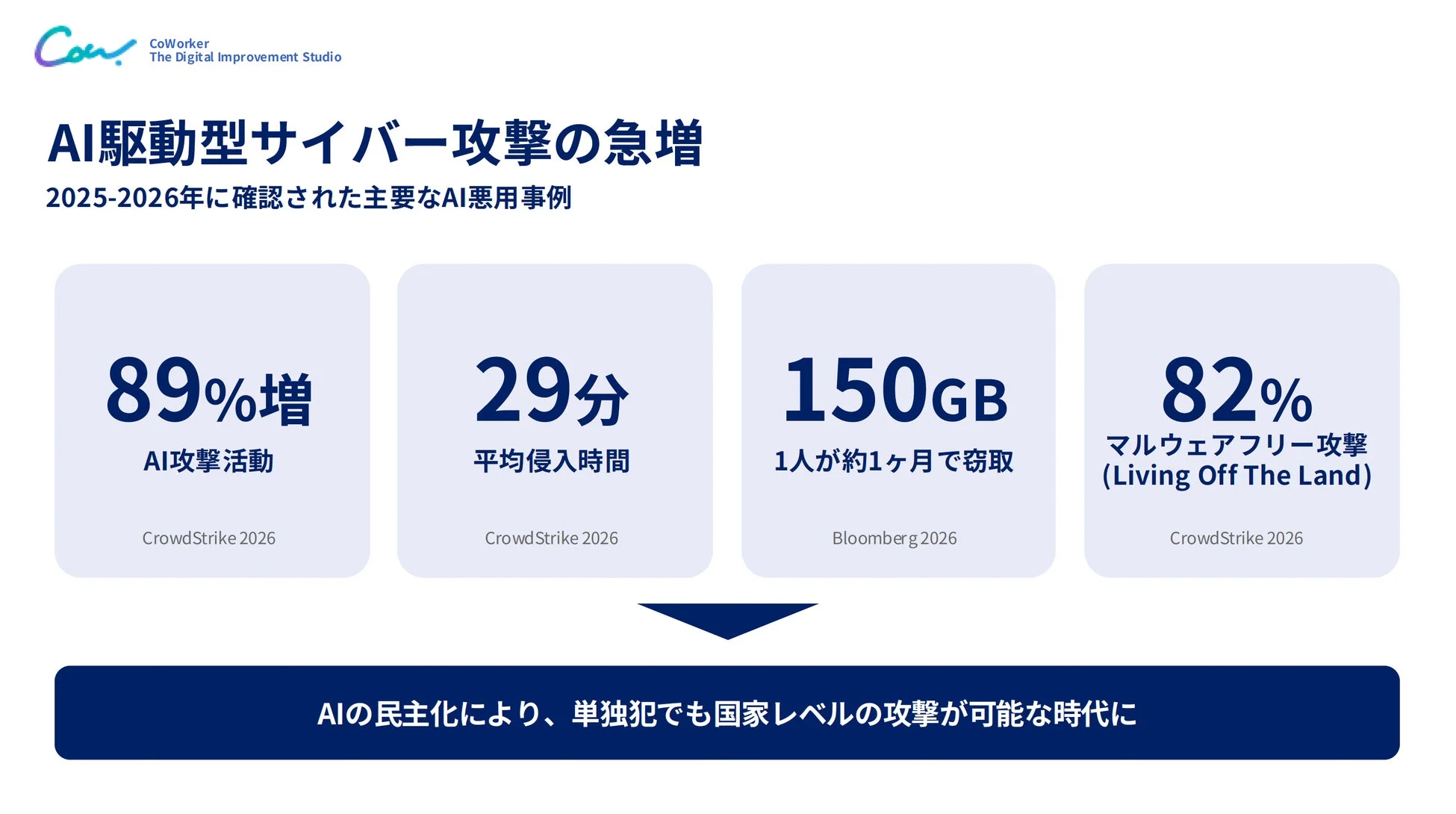 近年、生成AIの民主化によりサイバー攻撃の手法は急速に高度化しています。AIを活用することで、少人数でも高度な攻撃が可能となり、従来の防御体制では対応が難しい状況が生まれています。
