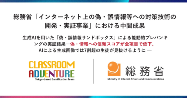 生成AI時代の偽情報対策に光明か、能動的プレバンキングで「見抜く力」向上 Classroom Adventureが総務省事業で中間成果 2026年1月5日:企業動向 株式会社Classroom Adventureは、総務省の事業において、生成AIを用いた「偽・誤情報サンドボックス」による能動的プレバンキングの実証実験を実施。体験者の偽情報識別能力が有意に向上し、特にAI生成画像では7割超の生徒が見抜けるようになったと報告し