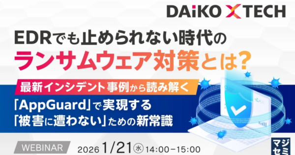 EDRでも防げぬ脅威、ランサムウェア対策に「被害に遭わない」新視点 マジセミがウェビナー開催 2026年1月5日:企業動向 マジセミ株式会社は2026年1月21日、「EDRでも止められない時代のランサムウェア対策とは?」と題したウェビナーを開催します。高度化するサイバー攻撃、特にランサムウェアの被害が拡大する中、従来のアンチウイルスやEDRだけでは対応しきれない現状に焦点を当て、「