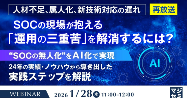 SOC運用現場の「三重苦」解消へ、LogStareがウェビナーを再放送 2026年1月5日:企業動向 LogStare株式会社は、セキュリティ運用現場が直面する「人材不足」「属人化」「新技術対応の遅れ」という「運用の三重苦」を解消するためのウェビナーを2026年1月28日に再放送します。AIを活用した「SOC無人化」の現実的なステップが解説されます。