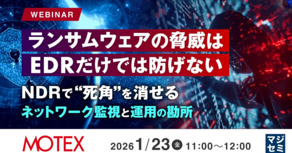 ランサムウェア対策、EDRだけでは不十分か マジセミが多層防御ウェビナー開催へ 2026年1月6日:企業動向 マジセミ株式会社は、近年深刻化するランサムウェア攻撃に対し、EDR(Endpoint Detection and Response)のみに依存せず、ネットワーク全体を可視化する多層防御の重要性をテーマとしたウェビナーを開催すると発表しました。