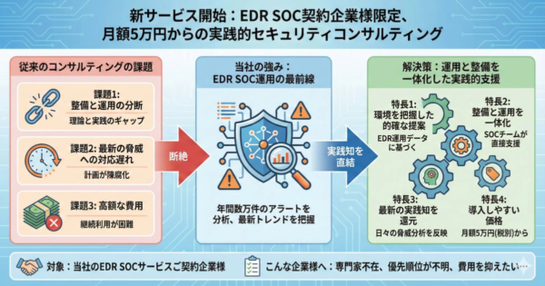 サイバーセキュリティ総研、EDR SOC契約者向けに新コンサルサービス 月額5万円から運用と整備を一体化 2026年1月5日:企業動向 株式会社サイバーセキュリティ総研は2026年1月より、EDR SOCサービスの契約企業を対象に、月額5万円(税別)から利用できるセキュリティコンサルティングサービスの提供を開始しました。この新サービスは、従来のセキュリティ整備と運用における分断、最新のサイバー