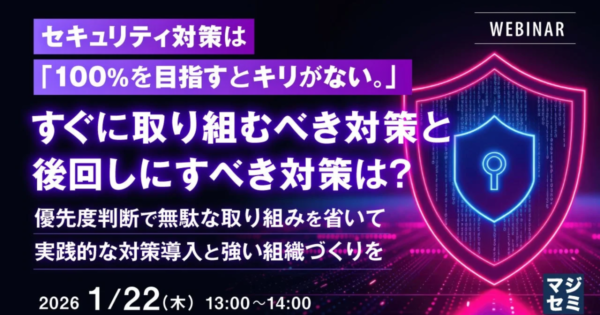 セキュリティ対策、「100%は非現実的」 マジセミが実践的ウェビナー開催へ 2025年12月26日:企業動向 マジセミ株式会社は、企業が直面するセキュリティ対策の課題に対し、「100%を目指すとキリがない」という視点から、優先順位付けと効果的な対策導入を支援するウェビナーを開催します。ランサムウェア感染の頻発やサプライチェーンリスクの増大を受け、限られたリソースで最適