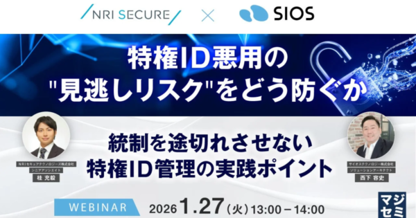 特権ID悪用、見逃しリスクに警鐘 マジセミが対策ウェビナー開催へ 2025年12月26日:企業動向 マジセミ株式会社は、サイオステクノロジー株式会社、NRIセキュアテクノロジーズ株式会社と共同で、特権ID悪用の見逃しリスクとその対策に関するウェビナーを開催すると発表しました。2026年1月27日にオンラインで開催されるこのウェビナーでは、複雑化するIT環境に