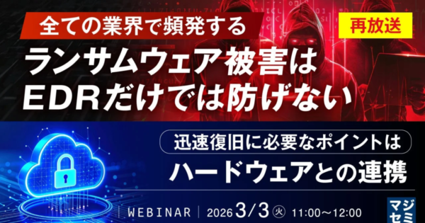 ランサムウェア被害にEDRだけでは不十分か? ハードウェア連携を解説するウェビナーが再放送 2026年2月16日:企業動向 マジセミ株式会社は、近年増加するランサムウェア被害への対策として、EDRだけでは不十分であり、ハードウェアとの連携が迅速な復旧に不可欠であると指摘するウェビナーの再放送を開催します。アサヒグループHDやアスクルの事例を挙げ、バックアップの限界と包括的な対策の必
