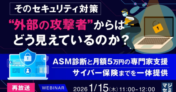マジセミ、『そのセキュリティ対策、”外部の攻撃者”からはどう見えているのか?』ウェビナーの再放送を発表 2025年12月23日:企業動向 マジセミ株式会社は、株式会社PFU主催のウェビナー『そのセキュリティ対策、"外部の攻撃者"からはどう見えているのか?』の再放送を発表しました。本ウェビナーでは、外部からの攻撃者の視点を取り入れたセキュリティ対策の重要性、ASM診断、専門家によるアドバイザリー支