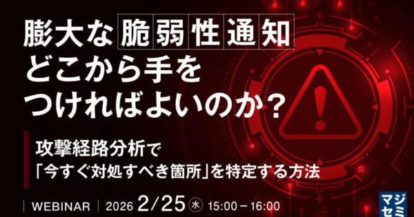 『膨大な脆弱性通知、どこから手を』マジセミがウェビナー開催へ 攻撃経路分析で優先順位付け解説 2026年2月2日:企業動向 マジセミ株式会社は、増え続ける脆弱性通知への対応に悩む企業向けに、攻撃経路分析を用いた優先順位付けの手法を解説するウェビナーを2026年2月25日に開催します。